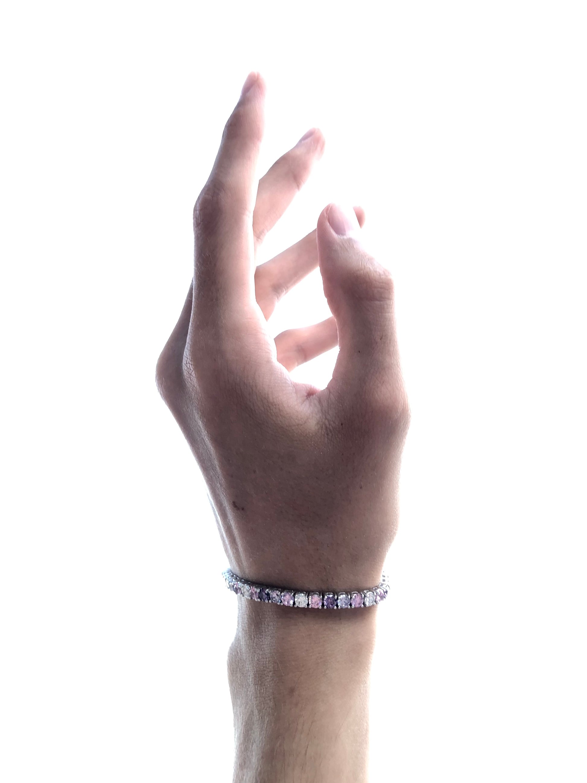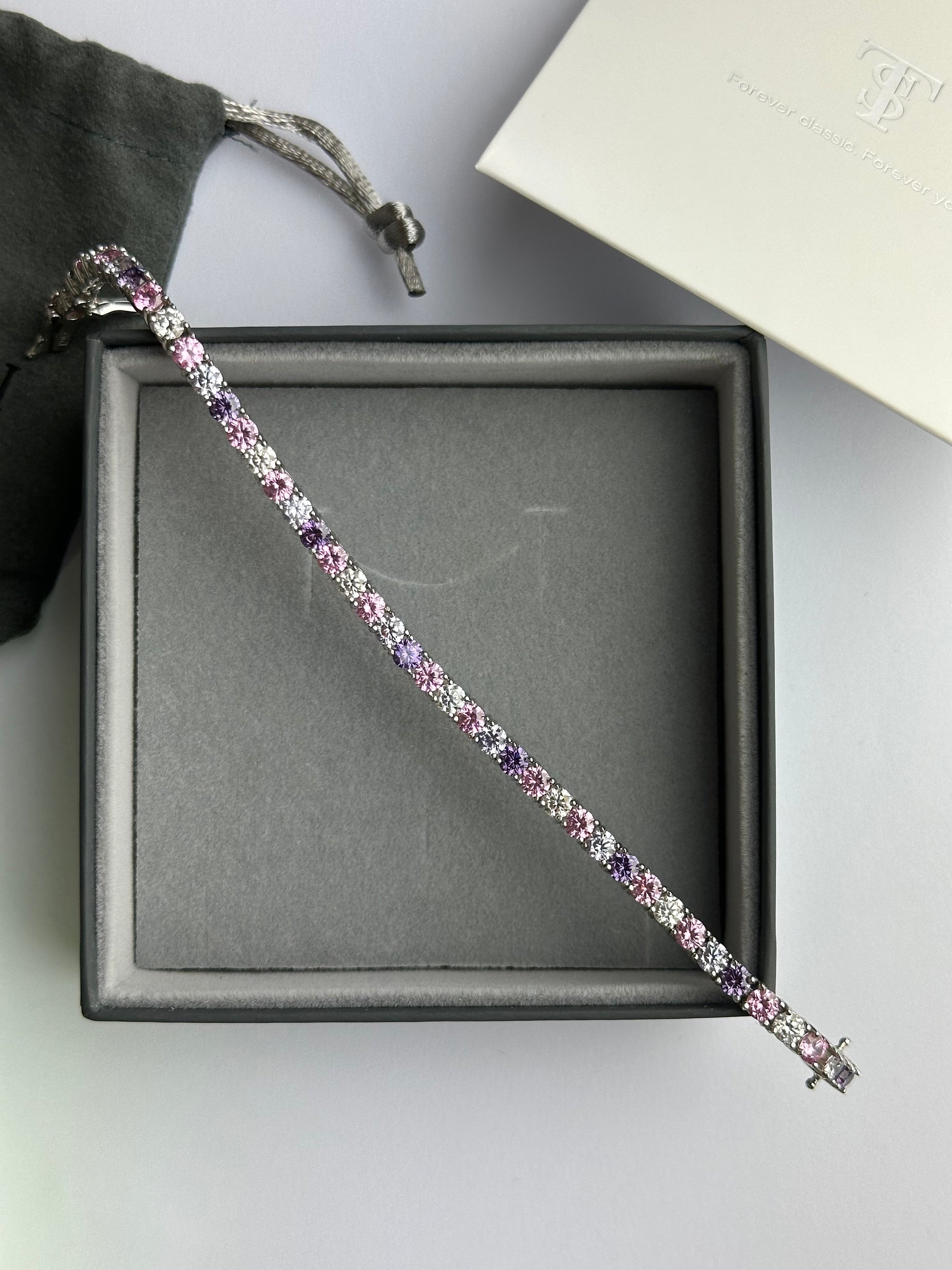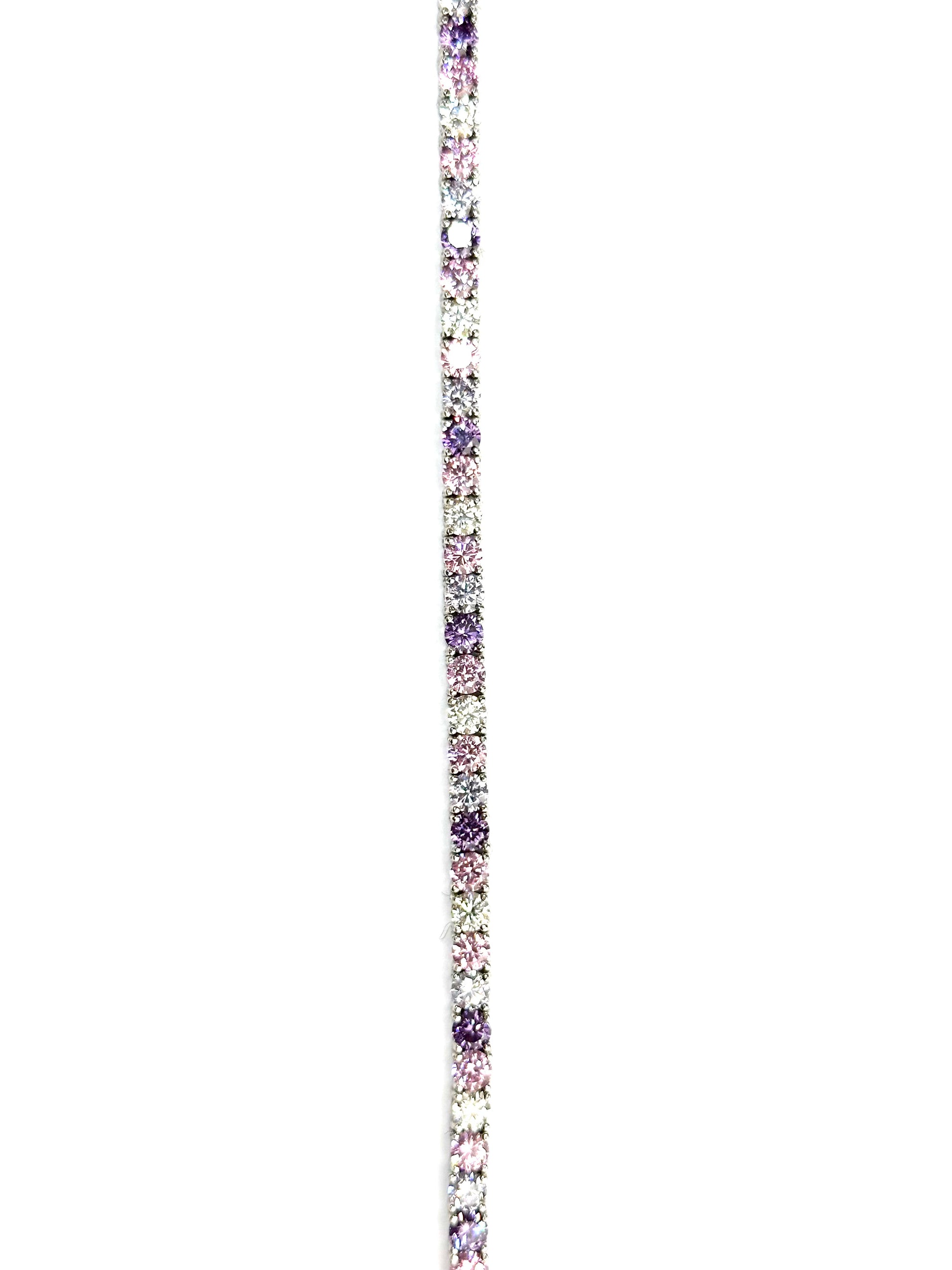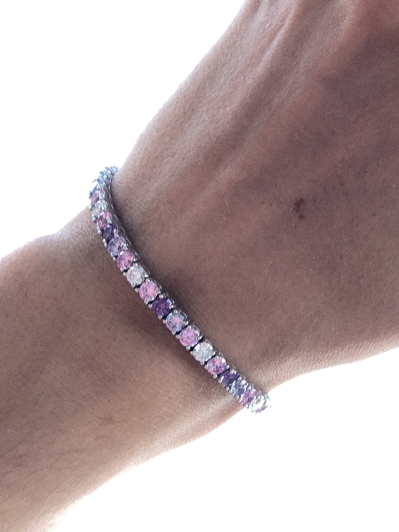 TENNESSI Tennis Bracelet collection's piece. Mixed brilliance of pink and purple shaded CZ and white moissanite stones, with VVS clarity, to achieve impeccable detailing.